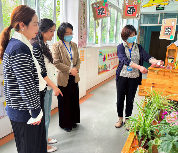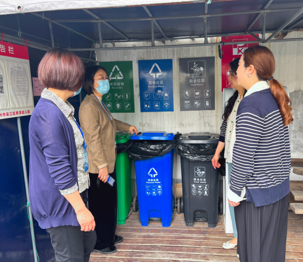 督学一行在胡园长的陪同下,重点对园所安全卫生、垃圾分类、校园文化建设等工作情况进行沟通与探讨。