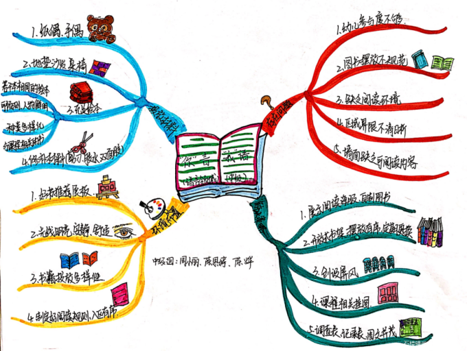 1.环境创设与氛围营造:创设具有书香氛围的园所公共环境;丰富班级阅读区,营造宽松自由的阅读氛围。