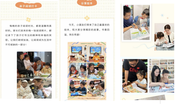 2.各班级在走廊墙面创设“分享阅读”“阅读打卡专栏:指导家长阅读的文章、亲子阅读的经验分享、展示“好书分享”“亲子阅读”的照片等。